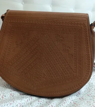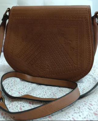 Bolso de hombro con un diseño grabado muy detallado. - Color marrón. - Correa ajustable. - Cierre de solapa. Tan solo tiene un par de usos pero una pequeña marca de algún roce estando guardado (se aprecia en l foto).