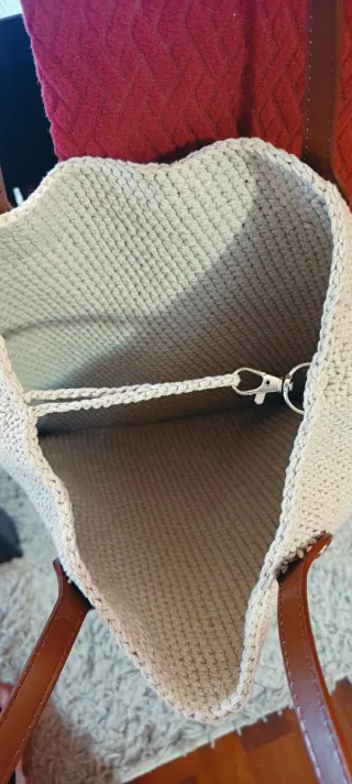 Bolso de mano tejido a crochet en color beige. Cuenta con asas de cuero y un pequeño detalle de cuero en la parte frontal. - Material: Crochet y cuero. - Color: Beige/piedra