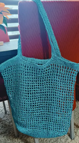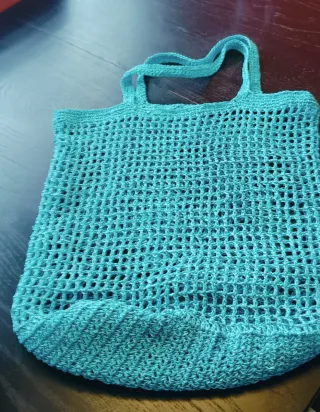 Bolso de mano tejido a crochet con un diseño de red abierto. Es un accesorio ligero y práctico. - Material: rafia - Color: azul verdoso