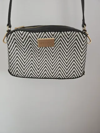 Bolso de mano Bimba y Lola con diseño de zigzag. - Tejido principal en blanco y negro. - Detalle de placa dorada con el logo de la marca.