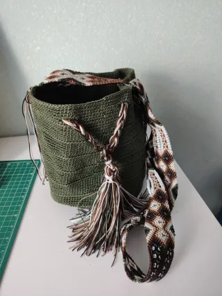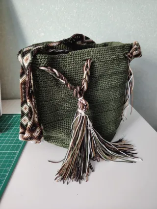 Bolso de crochet hecho a mano con un diseño único. - Color verde oliva. - Adornado con un detalle de flecos y trenzas. - Correa tejida con patrón de rombos en tonos marrones y blancos.