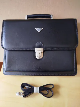Elegante maletín Polipiel en color negro. - Cierre metálico con logo. - Incluye correa para hombro.