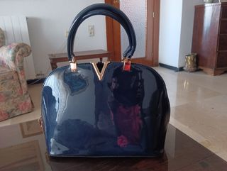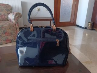 Elegante bolso de charol en color azul marino. - Acabado brillante. - Asa superior. - Detalle metálico en forma de V. - Dentro tiene dos separadores por lo que es muy práctico. Medidas Alto de Asas 14 cm Alto Bolso 22 cm Largo Bolso. 37 cm Ancho Base. 15 cm Largo Base. 29 cm
