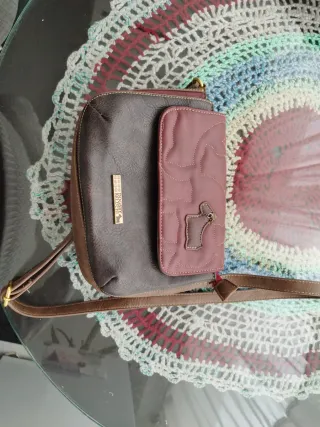 Bolso de nylon de la marca Bimba y Lola. - Color principal marrón topo. - Asas de mano y para colgarlos al hombro o bandolera con correa ajustable. - Placa metálica frontal. - 2 bolsillos interiores uno de ellos con cremallera - 1 bolsillo exterior en la parte de atrás - Ha tenido uso, pero sigue estando estupendamente para darle muchos usos más. - Combina con todo lo que te pongas.