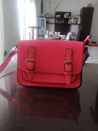 Bolso de mano en color rosa fucsia, con un diseño moderno y elegante. - Cierre con hebillas doradas. - Correa ajustable para llevar al hombro.