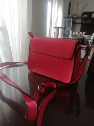 Bolso bandolera de piel en color rojo. interior de tela. bolsillo exterior e interior. Guardado en funda. Muy ligero y flexible, tiene asa larga para cruzar: ideal si tienes problemas de espalda porque no pesa. Traído desde EEUU Por mudanza he subido más bolsos, todos nuevos o semi-nuevos