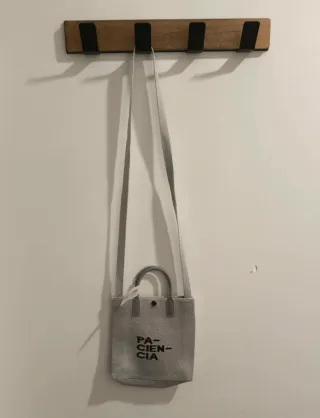 Bolso pequeño plateado con la palabra paciencia impreso en la parte delantera - Diseño brillante. - Asa corta y correa larga. - Cierre de botón a presión. - Está nuevo! Lleva la etiqueta!