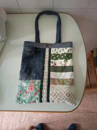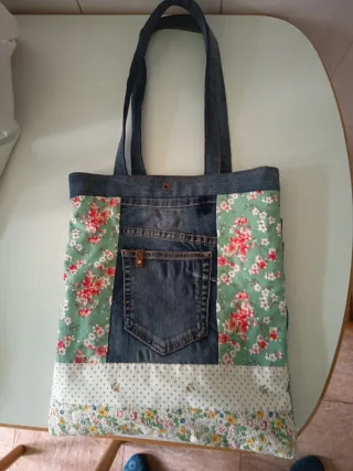 Bolso tote hecho a mano con retazos de tela y vaquero. - Diseño patchwork único. - Cierre de botón. - Bolsillo exterior de vaquero.