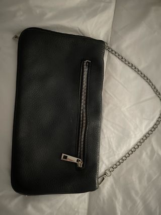 Bolso negro efecto piel (piel sintética) bastante amplio y cómodo, comprado en Pull&Bear. Por fuera está intacto, por dentro tiene desperfectos, nada importante ya que no se ven. Bien conservado.