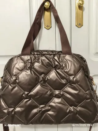Bolso bandolera con un diseño acolchado y moderno. - Material brillante. - Compartimento principal con cremallera. - Bolsillo frontal con cremallera. - Dos bolsillos laterales y otro trasero - Asas superiores y correa ajustable.