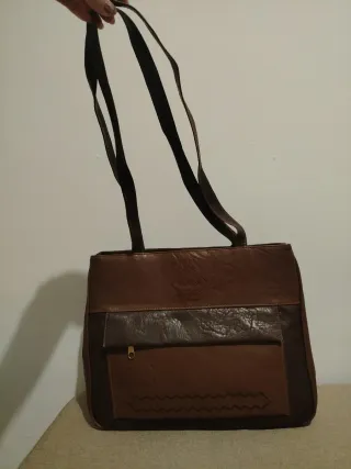 Bolso de piel en tono marrón, con un diseño elegante y práctico. - Compartimento frontal con cremallera. - Detalle de pespunte decorativo en la parte inferior. - Asas cómodas para llevar al hombro.
