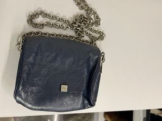 Fabricado en piel azul marino con cadena para colgar en bandolera.