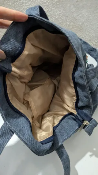 Bolso de tela con un diseño moderno y práctico. - Cierre de solapa. - Bolsillo exterior con cremallera. - Correa ajustable para llevar al hombro o cruzado. - bolsillo interior cremallera un poco deteriorado, pero cierra correctamente