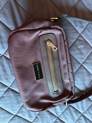 Bolso marrón de nylon con correa para atar al cuello. Tonos marrones fríos con detalles dorados. Tiene dos compartimentos exteriores y cuatro interiores. 24x17x10 cm