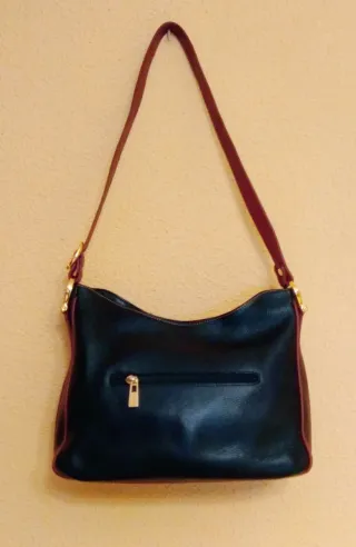 Bolso negro y marrón, tiene dos bolsillos interiores y uno exterior, la correa es extensible y mide 82 cm, el bolso mide 33 cm de ancho y 25 cm de alto.
