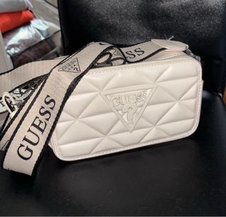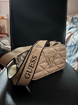 Bolso de la marca Guess en color beige con un diseño acolchado. - Correa ajustable con logo. - Detalle de logo metálico en la parte frontal.