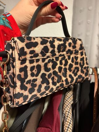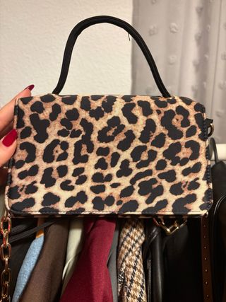 Elegante bolso de mano con estampado de leopardo. - Diseño rectangular. - Asa superior negra. - Cadena dorada para llevar al hombro.