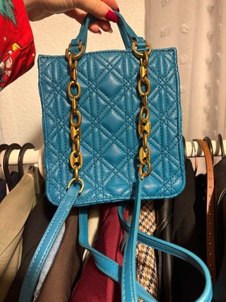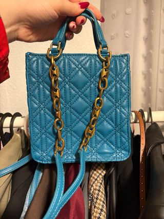 Bolso de hombro con un diseño acolchado y moderno. - Nunca lo he usado - Medidas: 30 x 30 cm - Acolchado con patrón de cuadrados. - Doble asa superior. - Cadena metálica de adorno. - Bolsillo exterior trasero con cremallera - En el interior tres bolsillos, uno de ellos con cremallera. - Bastante espacioso