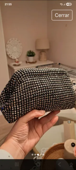 Elegante bolso de mano tipo clutch, perfecto para eventos y fiestas. Su diseño con pedrería le da un toque brillante y sofisticado. - Acabado con pedrería tipo strass. - Cadena metálica plateada para llevar al hombro o cruzado.