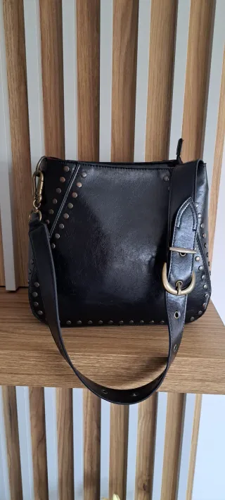 Bolso en color negro con asa larga regulable de bandolera con detalle de tachas. Cierre con cremallera y bolsillo interior con cremallera. Mide de ancho 30cm y de alto 18cm. Esta como nuevo usado en dos ocasiones.