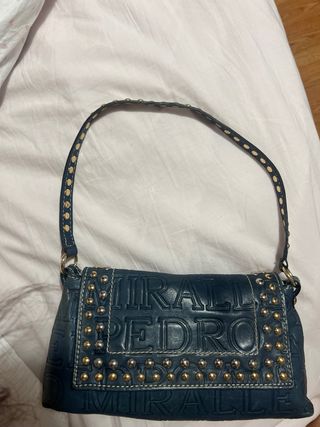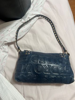 Elegante bolso de la marca Pedro Miralles, con un diseño llamativo y detalles metálicos. - Color azul marino. - Adornos en dorado y plateado. - Asa con tachuelas.