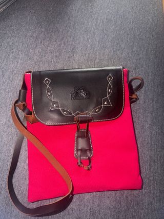 Bolso con solapa de cuero y cuerpo de tela. - Solapa de cuero marron con detalles bordados. - Cuerpo principal de tela color rosa. - Correa de cuero ajustable. - Cierre con trabilla y cordón.