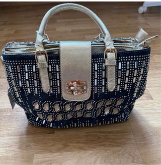 Bolso de estilo vaquero con un diseño llamativo y elegante. - Adornado con múltiples brillantes y detalles plateados. - Cierre principal con broche metálico. - Asas y detalles en acabado dorado.