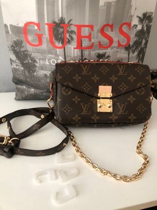 Precioso bolso bandolera en tonos beige y rojo. Es de tamaño pequeño y tiene una correa de cadena dorada. - Está en muy buen estado. - Perfecto para el día a día.Bolso bandolera en color beige tostado con motivos en el frontal.Cierre con cremallera .Varios compartimentos en el interior y en el exterior uno con cremallera Esta en perfecto estado