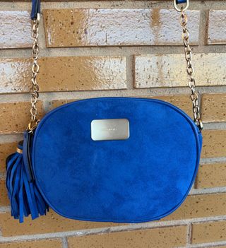 Elegante bolso de piel en color azul marino, con detalles de tachas doradas. - Cierre de cremallera. - Dos borlas decorativas. - Correa de mano y correa de hombro. - Bolsillo interior con cremallera. - Diseño moderno y versátil.