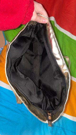 Bolso con un diseño vibrante y llamativo. - Combinación de materiales. - Detalles en cuero sintético. - Cierre de cremallera. - Asa de mano.