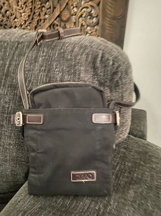 Bolso bandolera de la marca Mandarina Duck. - Material textil. - Asa de mano y correa ajustable para llevar al hombro. - Compartimento principal con cierre de cremallera. - Bolsillo exterior con cremallera. - Incluye funda guardapolvo con el logo de la marca. En las fotos se ve alguna pequeña mancha por dentro que aunque está lavado no se van Ligeramente desgastado en la parte frontal abajo se aprecia en foto y en algún punto de las correas de mano.