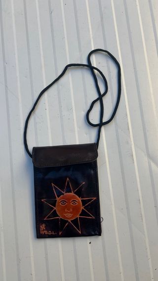Bolso pequeño con un diseño de sol en relieve. - Cierre de solapa. - Correa para colgar. - Detalle de sol con cara sonriente.