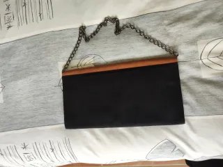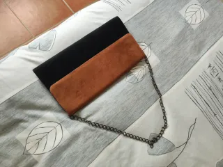 Elegante bolso tipo sobre con un diseño bicolor. - Material: Ante. - Combinación de colores: Marrón y negro. - Incluye cadena metálica y bolsillo pequeño en el interior.