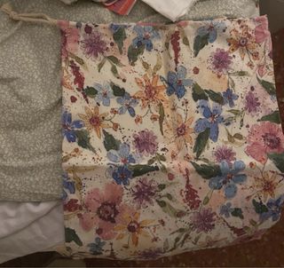 Bolsa con un bonito estampado floral. - Diseño con flores en tonos azules y rosas. - Cierre de cordón. - Tejido con detalles de salpicaduras.