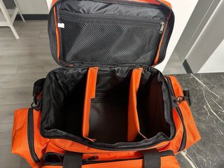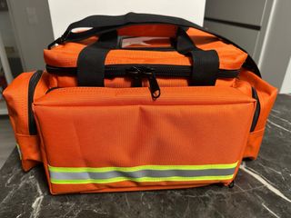 Bolsa de primeros auxilios de color naranja brillante, con detalles reflectantes. - Compartimento principal con cremallera y separadores adaptables. - Bolsillos laterales con cremallera. - Asa de transporte. - Correa para el hombro. Medidas: Ancho 40cm Alto 23cm Fondo 27cm
