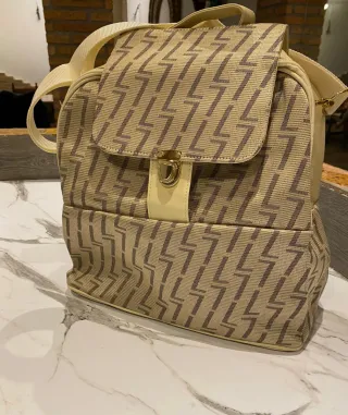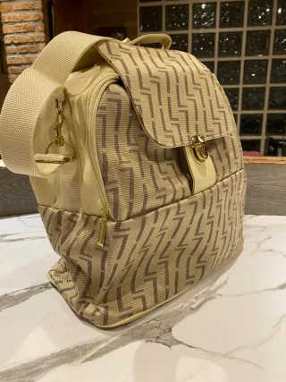 Bolso de mano con un diseño elegante y un patrón distintivo. - Color beige con estampado de logo en contraste. - Cierre de solapa con broche metálico. - Asa de mano y correa ajustable. -Medidas: alto 37cm; ancho 37cm; fondo 18cm.