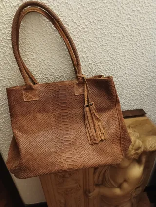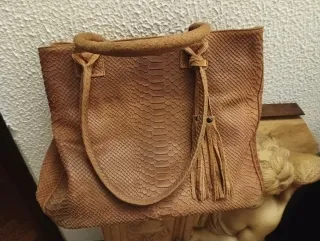 Elegante bolso shopper de piel, de fabricación italiana.En perfecto estado.Su diseño tipo piel de serpiente le da un toque sofisticado.Amplio alto 32 cm,ancho 38,base rectangular 36 por 17 cm.Asas en total 54 cm,se puede llevar al hombro.Detras lleva un bolsillo interior con cremallera.Cierre con cremallera y dos tiras de piel para ajustar con automático.En el interior hay un bolsillo con cremallera y una etiqueta de piel marrón donde figura Vera Pelle.Made in Italy - Material: Piel genuina ,gamuza en escamas. - Acabado: Textura piel de serpiente. - Asas cómodas para llevar al hombro o en la mano. - Detalle de flecos decorativos.