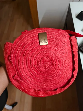 Bolso de mano redondo con un diseño tejido y un detalle metálico en la parte frontal. - Material tejido. - Color rojo vibrante. - Cierre con tiras.
