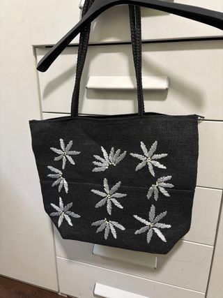 Bolso de rafia sin estrenar, con un bonito diseño. - Color negro con detalles plateados. - Adornado con bordados de flores. - Asas trenzadas.