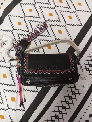 Bolso Desigual con un diseño llamativo y detalles bordados. - tres Asas. - Cierre de solapa, los imanes no funcionan (por eso el precio) - bolsillos, uno con cremallera Nuevo sin estrenar con etiqueta. Más en mi perfil. Hago envíos