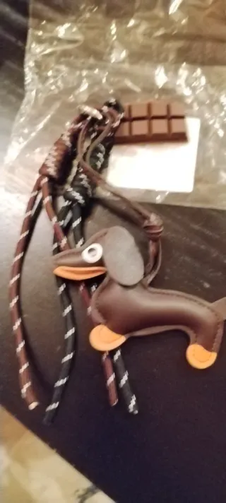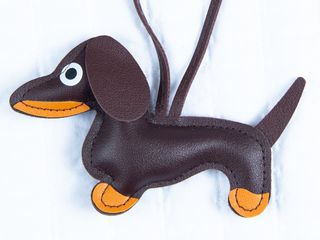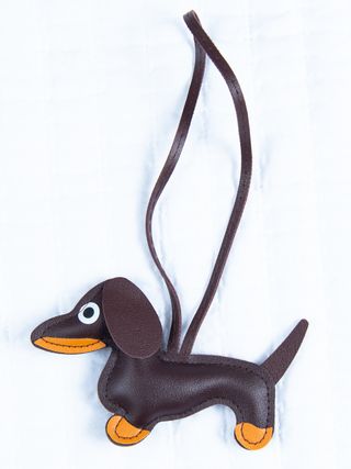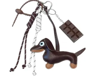 Original colgador para bolso o llavero con forma de perro salchicha. - Fabricado en piel. - Incluye charm de barra de chocolate. - Cuerdas decorativas. Hermes. Gucci. Chanel. Zara. Mango. Colgador bolso. Bolso. Regalo. Navidad