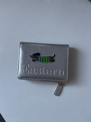 Cartera pequeña con un diseño divertido de un perro con jersey. - Color plateado. - Detalle de perro bordado con jersey a rayas verdes y azules. - Nombre Eastern grabado en relieve.
