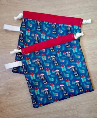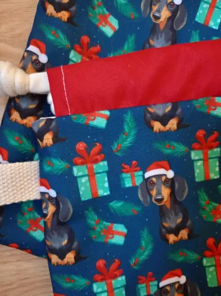 Bolsa de tela con un divertido estampado navideño de perros teckel salchicha con gorros de Papá Noel y regalos. - Diseño de perros salchicha. - Estampado de regalos y ramas de pino. - Ribete superior en color rojo. - regalo navidad