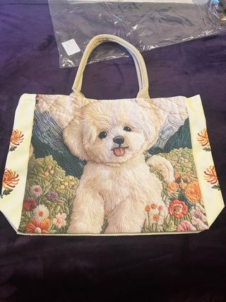 Bolso de mano con un bonito diseño de perro y flores. - Estampado de perro blanco en un paisaje. - Detalles florales en los laterales. - Asas de tela resistentes.
