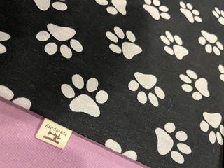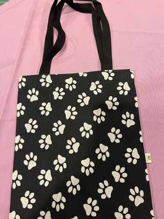 Bolso confeccionado a mano con un divertido estampado de huellas de perro. - Diseño de huellas blancas sobre fondo negro. - Asas negras resistentes. - Tejido de calidad. - Forrado y con bolsillo interior.
