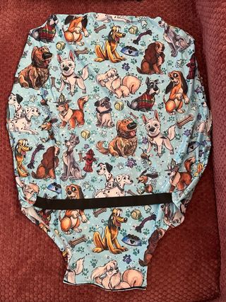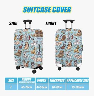Funda elástica para maleta de viaje con divertido estampado de perros. Protege la maleta de arañazos, suciedad y golpes, además de facilitar su identificación en el aeropuerto. Características: • Tamaño: L • Altura (sin ruedas): 65–70 cm • Ancho: 47–50 cm • Profundidad: 26–29 cm • Apta para maletas de 25–28 pulgadas • Material elástico, fácil de poner y quitar • Aberturas para asas y ruedas • Cierre inferior con cremallera Estado muy bueno. Ideal para viajes y para darle un toque original a tu maleta.