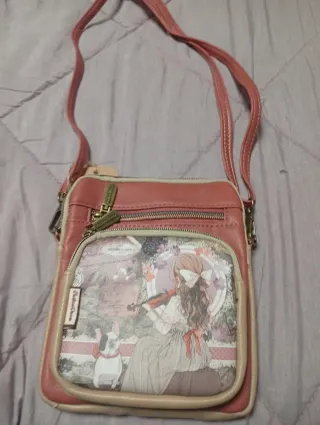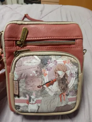Bolso pequeño con un diseño encantador. Ideal para llevar lo esencial. - Correa ajustable. - Compartimento principal con cremallera. - Bolsillo frontal con diseño de chica tocando el violín y un perro. - Entrego en Vicálvaro o hago envíos.