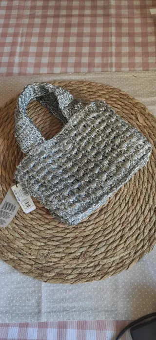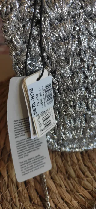 Elegante bolso de fiesta con un diseño tejido y detalles metálicos. - Acabado plateado brillante. - Asa de mano tejida. - Cadena metálica para llevar al hombro o cruzado.