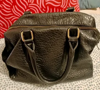 Bolso de mano en color negro, con un diseño elegante y espacioso. Ideal para llevar tus esenciales. - Material con textura. - Cierre de cremallera. - Dos asas. - Detalle de tirador en cremallera. Tiene un poco de desgaste en las asas.
