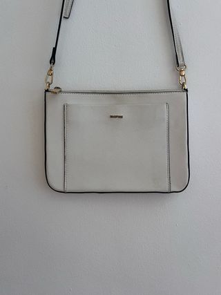 Parfois/ Bandolera acolchada crema. Correa de hombro desmontable + asas de mano color negro. Bolsillo frontal con cremallera. El bolso cierra con cremallera. Interior forrado en textil negro, cuenta con un bolsillo con cremallera. Formato: 25,5 cm de ancho x 21 cm de altura x 10 cm de profundidad. En excelente estado, solo usado una vez.
